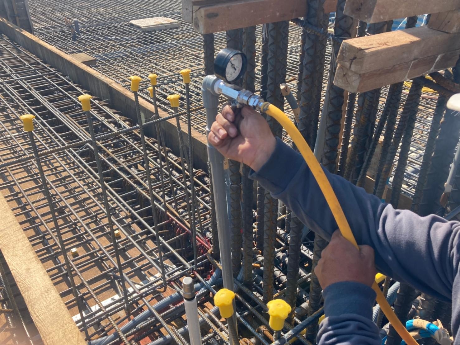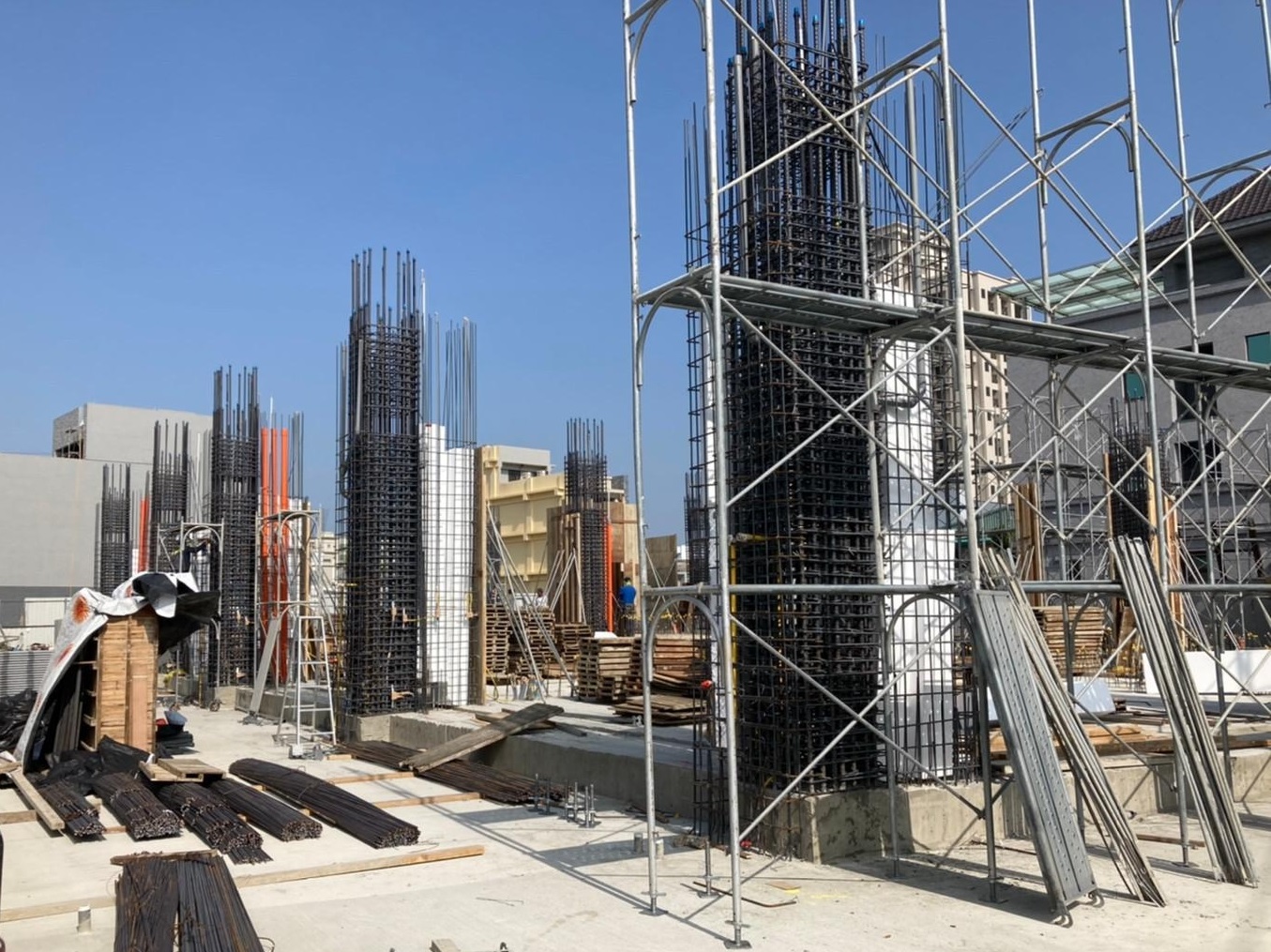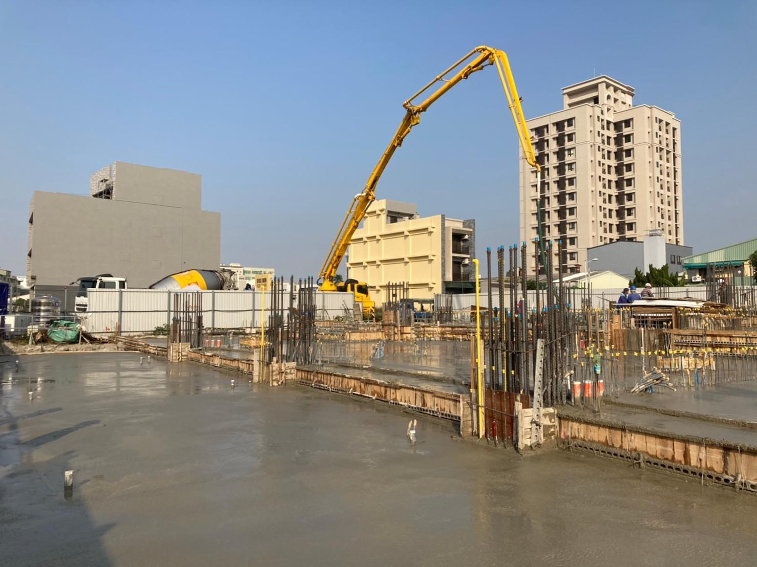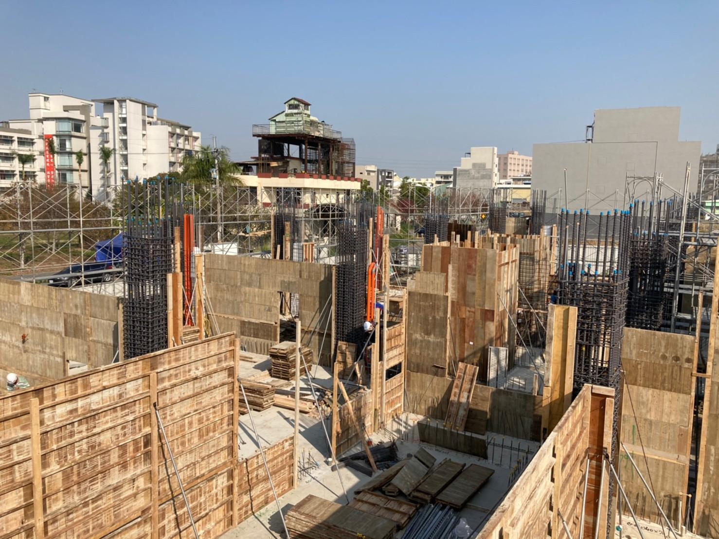 時序來到歲末,《恆山首恆》的地基與地下一、二層結構工程已宣告完成;在堅若磐石的根基上,基地內一樓搭起了向上延伸的施工鷹架,師傅們辛勤又謹慎地穿梭於柱牆模板間,未來是挑高7米的一樓門廳、公設與店舖空間;在中部穩定的天氣下,模板組立、鋼筋綁紮與續接、配管、灌漿、拆模、試水等工程皆縝密且順利地進行著,在工務主任跟技師確認現場施工與設計相符,清理後方可澆置混凝土,工程輪番施作,不只考驗著師傅們經驗和耐心,也考驗著現場工程師調度指揮的能力。